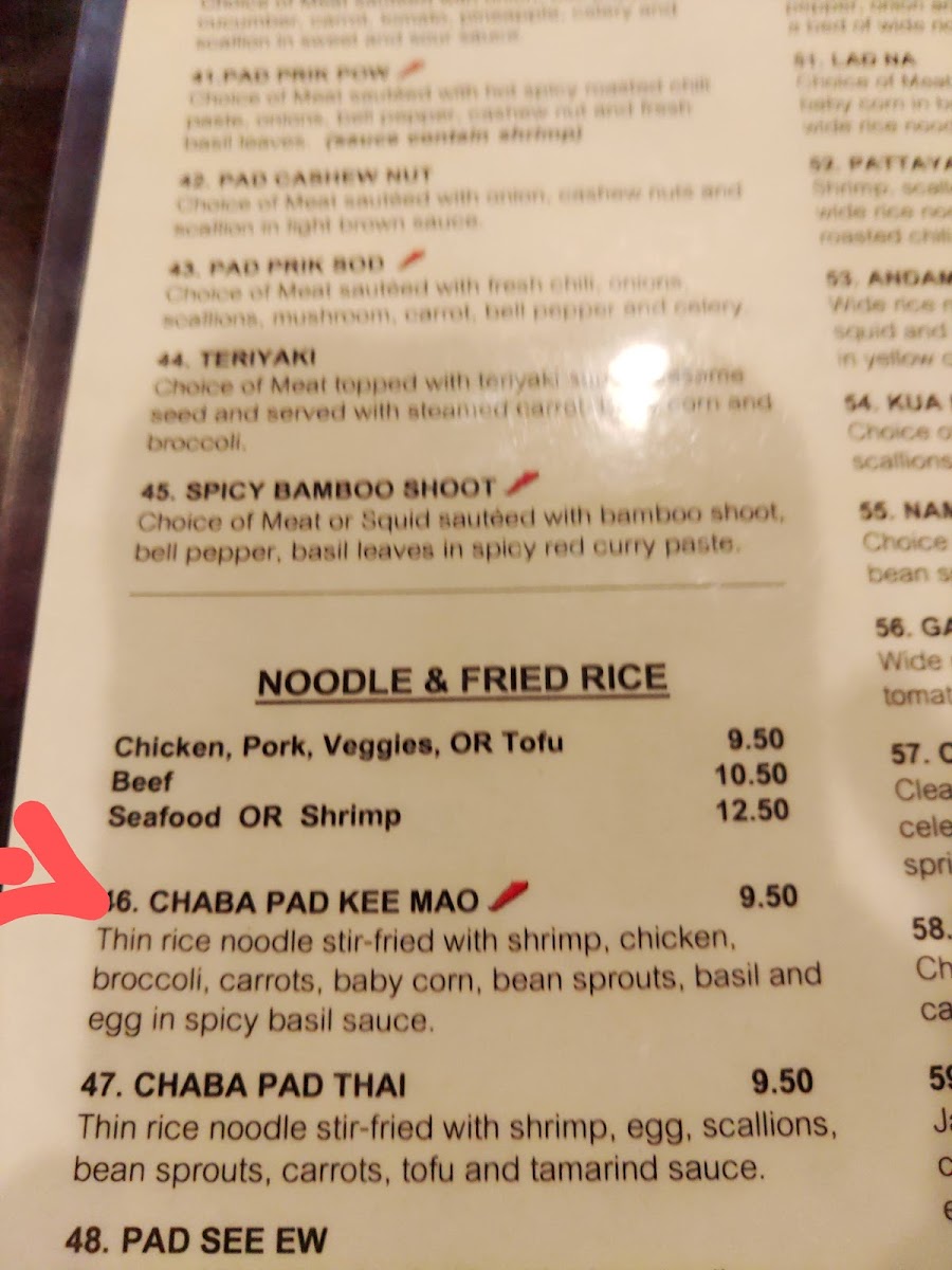 Spicy. Thin rice noodle stir-fried with shrimp, chicken, broccoli, carrots, baby corn, bean sprouts, basil, and egg in spicy basil sauce.